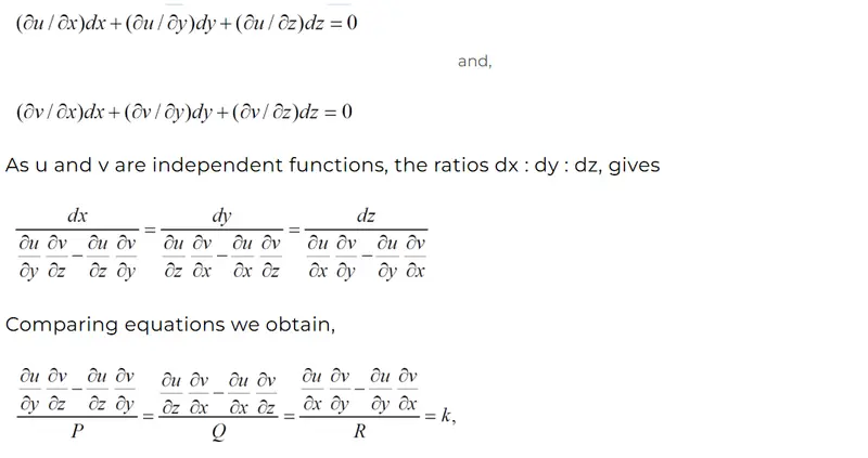 Substituting these values we get, k(Pp + Qq) = kR or Pp + Qq = R, which is the given equation (1). Therefore, if u(x, y, z) = c1 and v(x, y, z) = c2 are two independent solutions of the system of differential equations (dx)/P = (dy)/Q = (dz)/R, then Ф(u, v) = 0 is a solution of Pp + Qq = R, Ф being an arbitrary function.