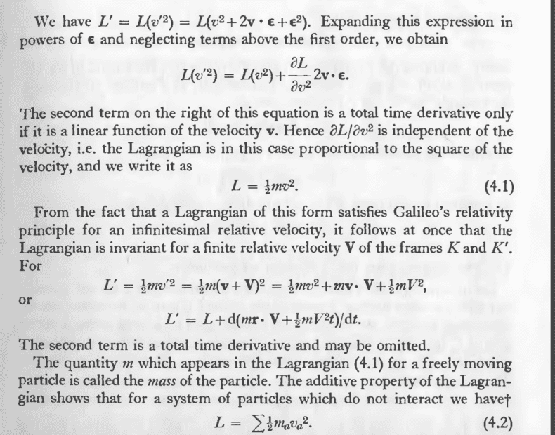 Then he says ##\frac{\partial L}{\partial v^2}## must be independent of velocity in order to have ##L' = L + \frac{d}{dt}(q,\dot q)## where we can omit ##\frac{d}{dt}(q,\dot q)##.
