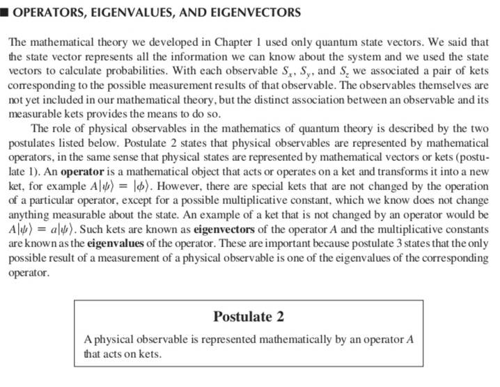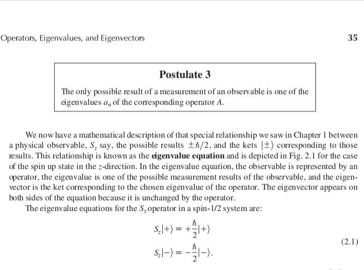 - Others reference the author's explanation of eigenvalue equations, noting that the observable is represented by an operator, the eigenvalue corresponds to possible measurement results, and the eigenvector is unchanged by the operator.