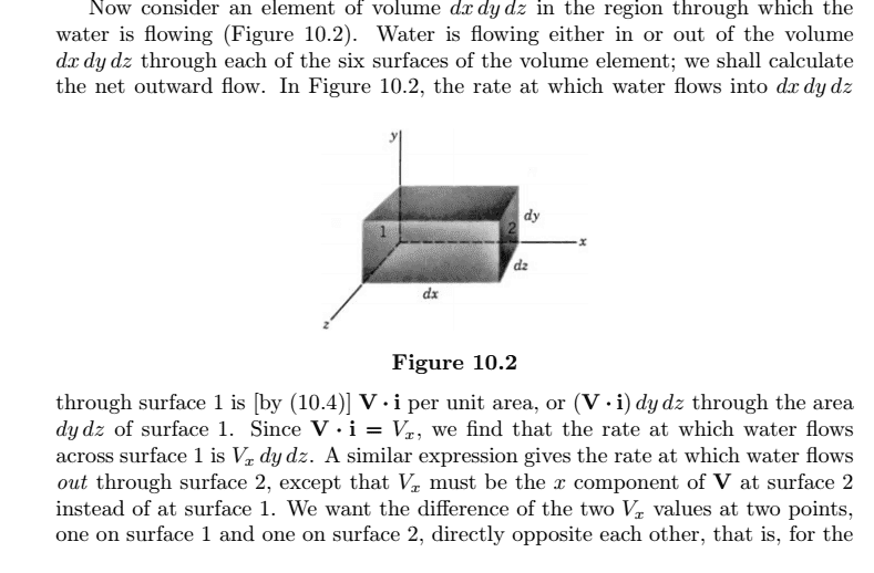 The text states that water is flowing either in or out of the volume through each of the six surfaces, so that there is possible difference of velocity between the two surfaces in x-axis, namely some water come in from surface 1 may come out from other surfaces in y or z axis rather than surface 2.Hawkingo said:View attachment 236565 View attachment 236566