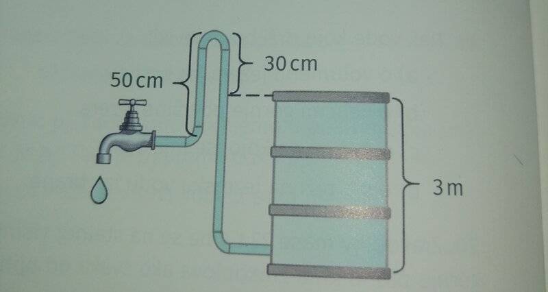 I was expecting the answer to be "water will not come out thrugh the faucet because the pressure from the barrel is not strong enough to overcome the height of the pipe" since pressure depends only on height, gravitational constant and density of liquid, which is in this case water.