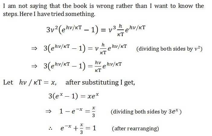 No, x is not that, it's [tex]\hbar c/\lambda k T[/tex] infact it then writes the Wien's displacement law in terms of wavelength, but the book omits to write that then you should use the other Planck equation (with wavelength) and it's a quite bad omission; I understand your concern.En Joy said: