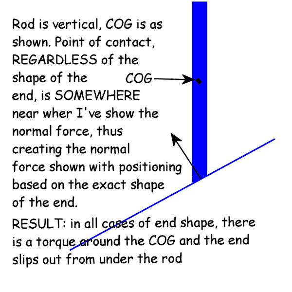 But without friction, a rod would slide off the end of the ramp before it began to lean away from the perpendicular. In the short term, the shape of the rod-end in contact with the ramp is irrelevant, so long as a perpendicular to the ramp, that passes through the centre of gravity, also passes through the contact patch or point.