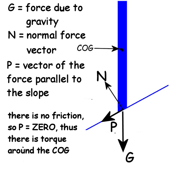 But if CP is not normal (not perpendicular) to the slope, then R produces a torque about C. (It’s probably better to think in terms of a couple: there is a couple - formed by R and a component of W, acting on the rod.) So the rod rotates (‘falls over’) while it slides downhill.
