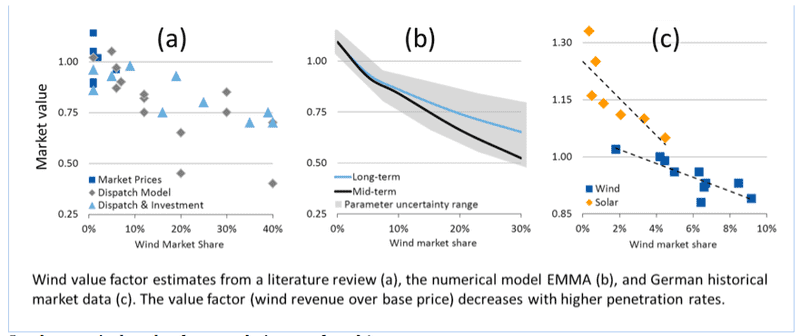 Wind for instance devalues to about 85% of its original value at 10% grid share. Solar devalues much faster.