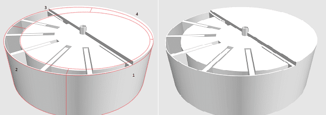 The engine is a closed cylinder with many sliding vanes creating chambers that increase and decrease in volume. Other than a drive shaft and perhaps a valve stem to add a liquid and pressurize the unit there is no entrance or exit for the working fluid (it is not a water wheel). The external radius will have attached heat exchange surfaces or insulation as is required to handle the intended thermal exchange. The activity in the circular cycle of each chamber can be visualized when separated into quadrants (red outline), including two areas where the chamber volume changes very little, one large (3) and one small (1) and two where the chamber volume is either increasing (2) or decreasing (4) when the rotor is turned (clockwise).