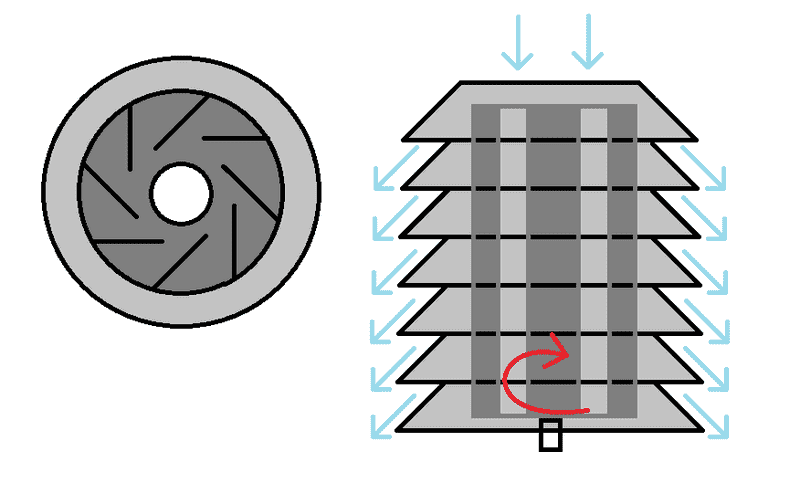 I was thinking if the fan blades were at a pretty large distance and tall, it could move quite a bit of air. With a larger diameter, it wouldn't need to spin as quickly as a smaller unit.