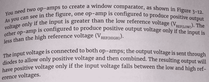 So I've been reading an intro book to electronics and I got to a section about operational amplifiers. It talks about different uses of them and how they can be used as comparators. It then talks about a specific comparator called a window comparator which will output a positive voltage if the input voltage is in between the high and low reference values. Here is the diagram they give: