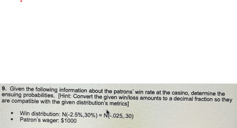 The discussion centers on calculating the losing distribution in a casino context, specifically using a normal distribution function. The patrons' winnings are described by a normal distribution, N(-0.25, 0.3), indicating a mean of -0.25 and a standard deviation of 0.3. The participants clarify that "losing" refers to winning less than $0, and they explore how to derive probabilities related to losses based on the given winning distribution. The conversation emphasizes the need to convert win/loss amounts into decimal fractions for accurate calculations.