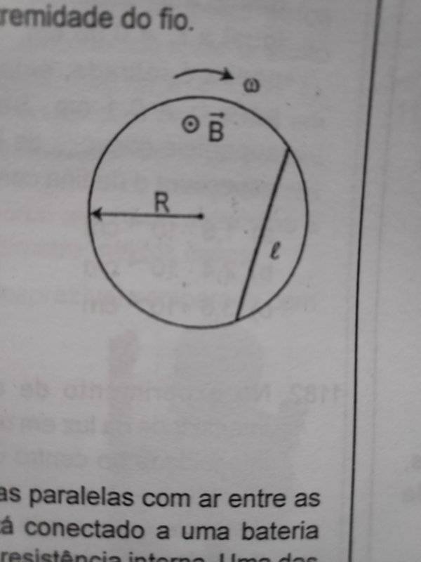 - A conducting wire of lengh l is fixed to an insulator disk that rotates with ω. The wire is on a plane perpendicular to a uniform magnetic field B. Find the potencial difference between the middle of the wire and one of it's ends.