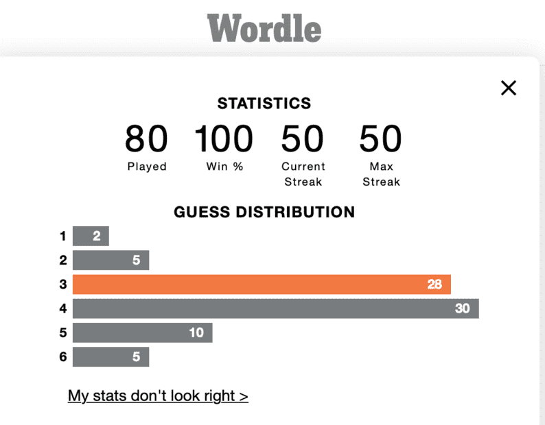 You don’t need to lose a game to break the streak. Missing a game also breaks it. For example, my current streak is 3 and based on my posts in this thread, I missed game 480 and solved 481, 482, 483.kuruman said:Mine is incomprehensible. The area under the curve (games won) is W = 80, the total games played is N = 80, yet the current streak is 50. How can that be? If the streak is broken, I must have lost at least one game in which case one would expect W < N plus I don't remember losing any games. My stats don't look right, but clicking the link doesn't do much for me. Anyway, I'm not losing any sleep over this.