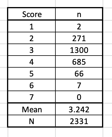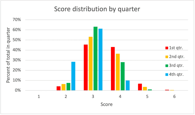 Finally, the bar graph below shows the distribution of scores for each quarter. The shift to lower scores is clear. In the 4th quarter there is a marked increase in the scores of 2 from under 10% to almost 30% of the total.