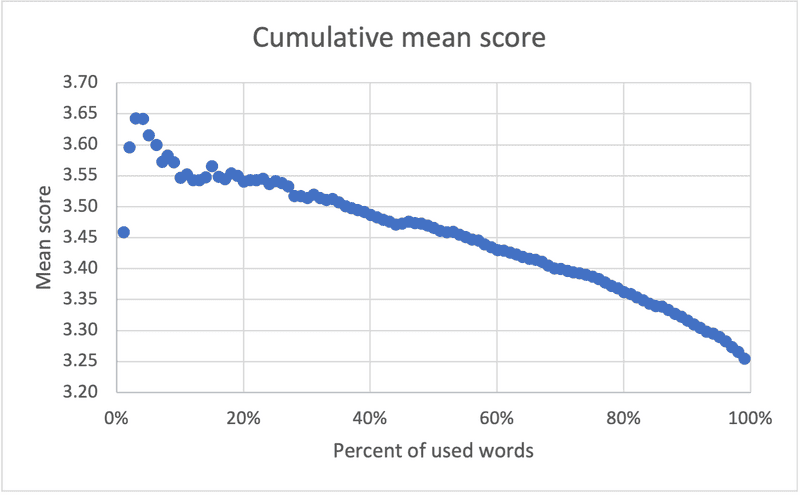 The graph below shows snapshots of the mean as a function of already used words. It has a negative first derivative and a negative second derivative that becomes more apparent near the end. There are 100 data points recorded in intervals of 1%.