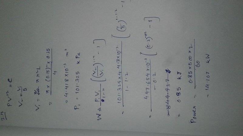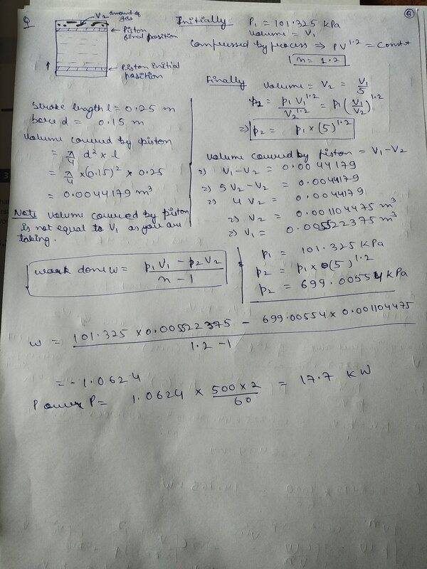 : [/B]At the beginning of the compression stroke of a two-cylinder internal combustion engine the air is at a pressure of 101.325 kPa. Compression redeuces the volume to 1/5 of its original volume, and the law of compression is given by PV^1.2 = const. If the bore and stroke of each cylinder is 0.15 m and 0.25 m , respectively, determine the power absorbed in kW by compression strokes when the engine speed is such that each cylinder undergoes 500 compression strokes per minute.The answer is given as : 17.95 kW