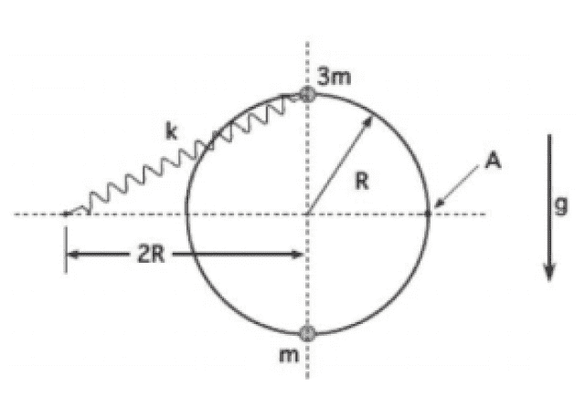 The heavier object (mass = 3m) is attached to a spring with an unstretched length of zero and spring constant k. The fixed end of the spring is then attached to a point a horizontal distance 2R from the center of the circle. It is stated that the lighter object (mass = m) is initially at rest at the bottom of the ring, and that the heavier object is released from rest at the top of the ring. Then it collides with and sticks to the lighter object.