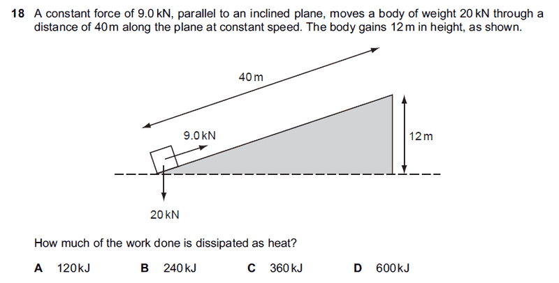 The discussion centers around calculating the work done on an object moving up a plane and how much of that work is dissipated as heat. The initial confusion arose from the participant's calculation of work done, which resulted in 240 kJ instead of the expected 120 kJ. Key points include the application of the work-energy theorem, where the total work done by all forces equals zero due to constant speed, indicating that the work of gravity and the applied force must balance with the work done against friction. The applied force contributes 360 kJ, gravity does -240 kJ, and the difference indicates the work dissipated as heat. Ultimately, understanding the roles of each force clarified the solution, confirming that the dissipated work aligns with the change in potential energy.