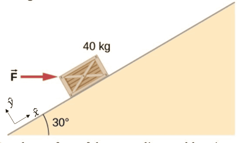 - Shown below is a 40-kg crate that is pushed at constant velocity a distance 8.0 m along a incline by the horizontal force F. The coefficient of kinetic friction between the crate and the incline is u_k = 0.4 Calculate the work done by (a) the applied force, (b) the frictional force, (c) the gravitational force, and (d) the net force.