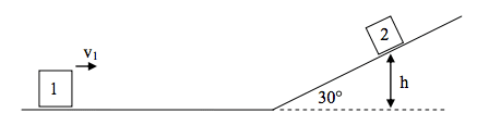 an incline, as shown (from height hi). They meet on the horizontal section of track. After