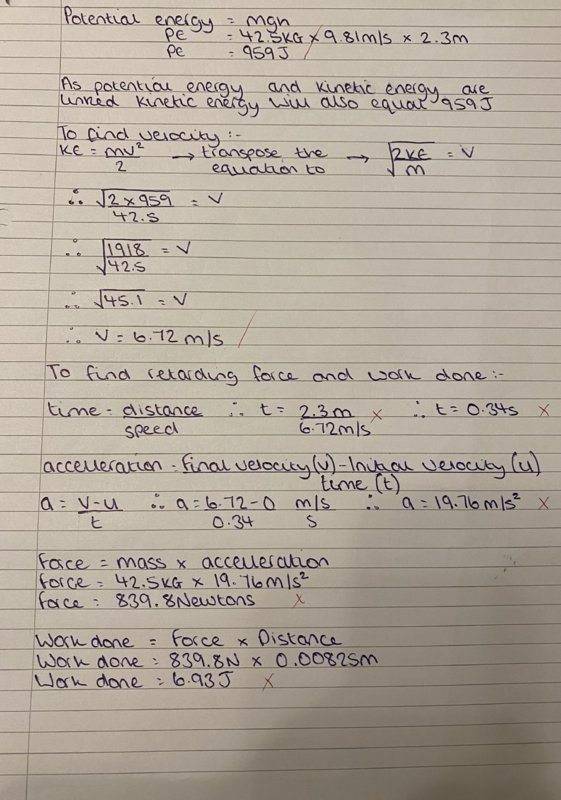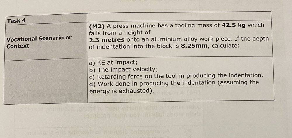 - A press machine has a tooling mass of 42.5kg which falls from a height of 2.3 metres onto an aluminium alloy work piece. If the depth of indentation into the block is 8.25mm calculate the following: