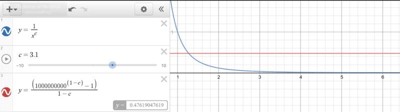 I would like to be able to give an "AUC" level between an arbitrary range, and from each AUC level given, calculate approximately "c". This "c" will then be put back into the original y=1/x^c equation. The shape of the y=1/x^c curve will then dictate a part of the synth's sound.