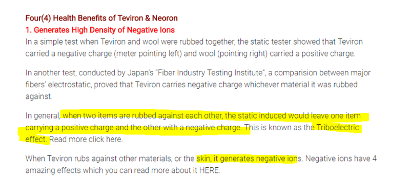 The discussion centers on the NEFFUL clothing's ability to release anions through the Triboelectric effect when in contact with skin. Participants express skepticism about the claims of health benefits associated with these anions and seek peer-reviewed journal articles to substantiate these assertions. The conversation highlights the need for scientific validation of the health benefits mentioned in the attachment, particularly regarding the fate of cations produced during ionization.