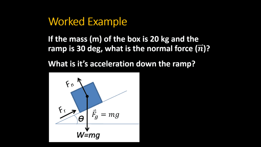 - If the mass (m) of the box is 20 kg and the ramp is 30 deg, what is the normal force (𝒏 ⃑)?