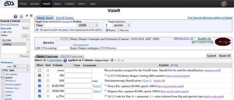 I would like to explore the Henry Draper (HD) catalogue of stars so that I can improve my understanding of the host stars of many exoplanets. When I went to Wikipedia, they provided a link to this site. https://vizier.cds.unistra.fr/