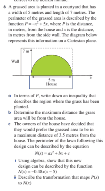 The inequality describing the region where grass has been planted is defined by the parabolic curve \( P = 5x - x^2 \) for the interval \( 0 \leq x \leq 5 \). The planted region, denoted as \( R \), is located below this curve and above the x-axis, leading to the correct representation as \( 0 \leq R \leq P \). The initial suggestion of \( P < x^2 - 5x \) is incorrect. A graph illustrating this relationship clarifies the misunderstanding regarding the shape of the planted area.