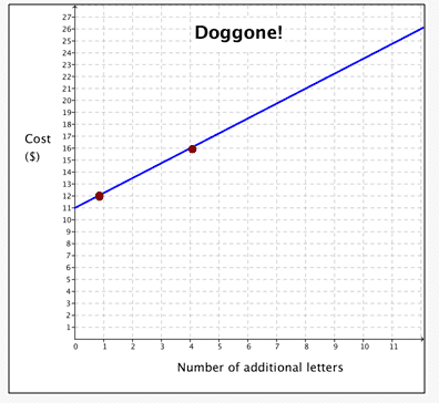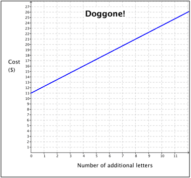 12. The Doggone Leash Company offers personalized dog accessories. The dog’s name is printed on items such as leashes and collars. A basic fee is charged for the first 10 letters of the dog’s name, and an additional charge applies to each letter after that. The graph shows the relationship between the total cost of the service and the number of additional letters in the dog’s name.