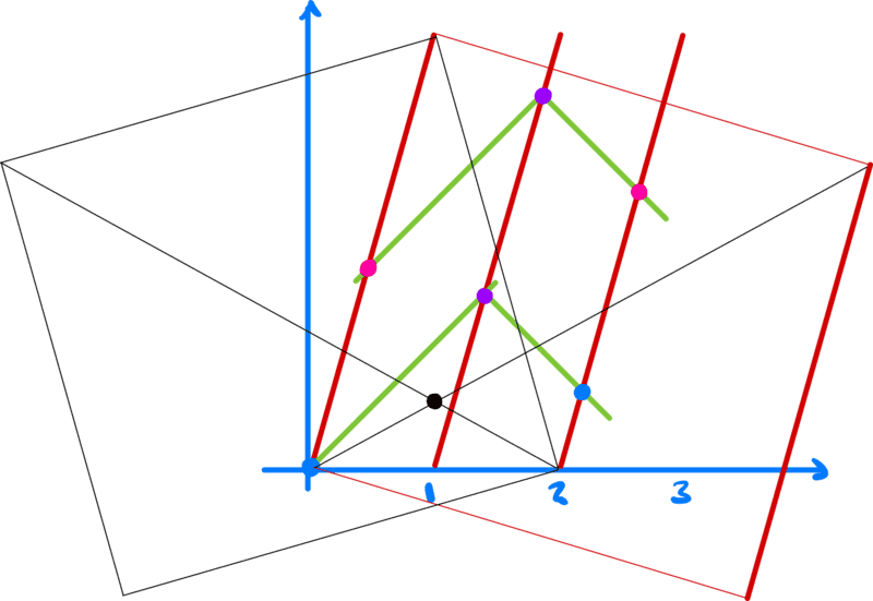 I have drawn the two boxes just to show the symmetry and that in fact the angles are drawn correctly (I think). The point I want to talk about here is the black point.
