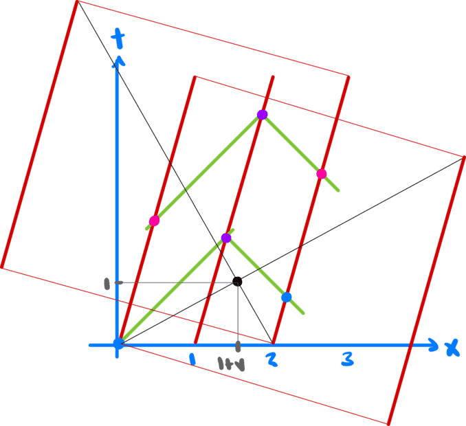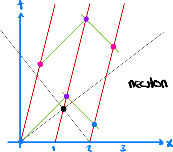 What it means is that under Newton's transformations the origin is synchronous with ##(2,0)## in all frames, which means that a light ray emitted from these two spacetime points reach the equidistant purple point at the same time.