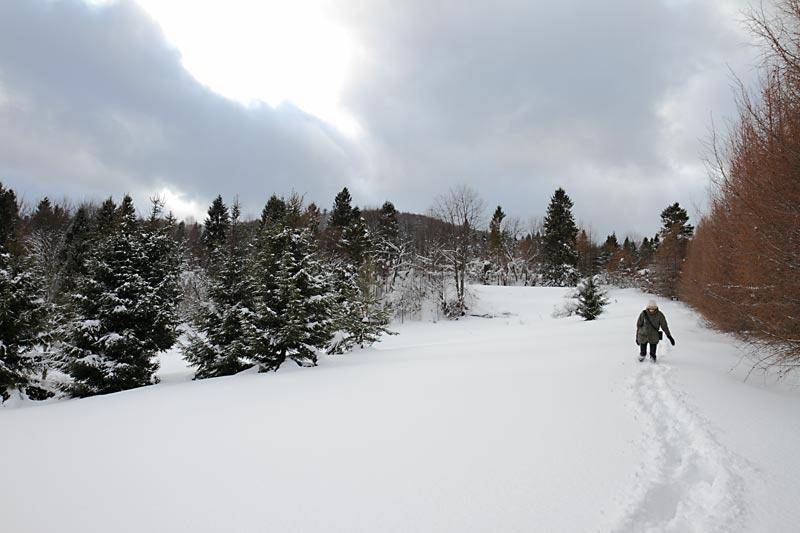 We were not expecting fresh snow here, but that's what we found. In some places it was half thigh high (or even half [censored]body part on the back, just above the thigh[/censored] high), but mostly just to the knee. I was breaking the trail, Marzena was following: