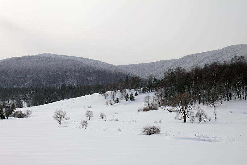 Bieszczady are not high (most peaks are below 4000 ft). Some of the higher peaks are bald - which is rather unusual in other Polish mountains (apart from rocky peaks in Tatra mountains, but they are much higher). These bald parts are called "połoniny" - my dictionary translates it as mountains pastures, but I am not sure they were ever used as pastures. This flat white snow that doesn't want to have any texture is a połonina: